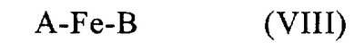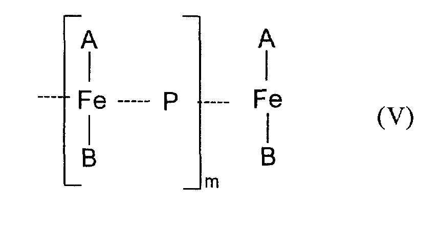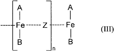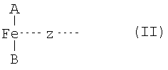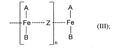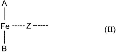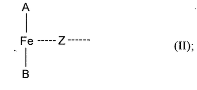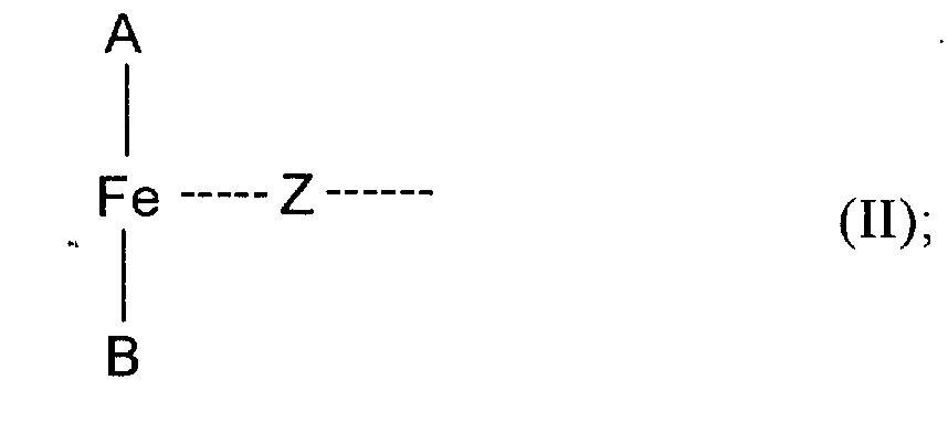 1. Композиция, которая включает I) одно или несколько соединений формулы (I): где Х обозначает группу формулы (II): Y обозначает группу формулы (III) где каждый из А и В независимо обозначает незамещенное или замещенное ароматическое углеродное кольцо или незамещенное или замещенное ароматическое гетероциклическое кольцо; группа или каждая группа Z независимо представляет собой незамещенную или замещенную двухвалентную гидрокарбильную группу; n обозначает 0 или целое число от 1 до 10; при условии, что соединение формулы (I) не отвечает формуле (IV): где R5 или R6 и R7 или R8 обозначают этил; и II) разбавитель или носитель; в которой одно или несколько соединений формулы (I) содержатся в количестве, достаточном для достижения концентрации железа по меньшей мере 1 мас.% в пересчете на массу композиции. 2. Композиция по п.1, где Z, когда n обозначает 0, или одна или каждая из нескольких групп Z, когда n обозначает число от 1 до 10, представляет собой незамещенную или замещенную двухвалентную углеводородную группу. 3. Композиция по п.2, где Z, когда n обозначает 0, или одна или каждая из нескольких групп Z, когда n обозначает число от 1 до 10, представляет собой незамещенную или замещенную двухвалентную алкиленовую группу, содержащую в алкиленовом мостике по меньшей мере один углеродный атом. 4. Композиция по п.3, где Z, когда n обозначает 0, или одна или каждая из нескольких групп Z, когда n обозначает число от 1 до 10, представляет собой незамещенную или замещенную двухвалентную алкиленовую группу, содержащую в алкиленовом мостике от 1 до 10 углеродных атомов. 5. Композиция по п.3 или 4, где Z, когда n обозначает 0, или одна или каждая из нескольких групп Z, когда n обозначает число от 1 до 10, представляет собой незамещенную или замещенную двухвалентную алкиленовую группу, содержащую в алкиленовом мостике по меньшей мере два углеродных атома. 6. Композиция по п.4, в которой Z, когда n обозначает 0, или одна или каждая из нескольких групп Z, когда n обозначает число от 1 до 10, представляет собой незамещенную или замещенную двухвалентную алкиленовую группу, содержащую в алкиленовом мостике один углеродный атом. 7. Композиция по любому предыдущему пункту, где Z, когда п обозначает 0, или одна или каждая из нескольких групп Z, когда п обозначает число от 1 до 10, замещена одним или несколькими заместителями, выбранными из алкильных групп, замещенных алкильных групп и групп, отвечающих формуле (V) в которой каждая группа А и В независимо представляет собой незамещенное или замещенное ароматическое углеродное кольцо или незамещенное или замещенное ароматическое гетероциклическое кольцо; каждый Р в случае его наличия независимо обозначает незамещенную или замещенную гидрокарбильную группу; m обозначает 0 или целое число от 1 до 10. 8. Композиция по любому из пп.1-6, где Z, когда n обозначает 0, или одна или каждая из нескольких групп Z, когда п обозначает число от 1 до 10, представляет собой в которой каждый из R1 и R2 независимо обозначает водородный атом или незамещенный или замещенный алкил, незамещенный или замещенный арил или незамещенный или замещенный аралкил; а х обозначает целое число, составляющее по меньшей мере 1. 9. Композиция по п.8, где каждый из R1 и R2 независимо обозначает водородный атом или незамещенный или замещенный C1-С6алкил, незамещенный или замещенный С6арил или незамещенный или замещенны
