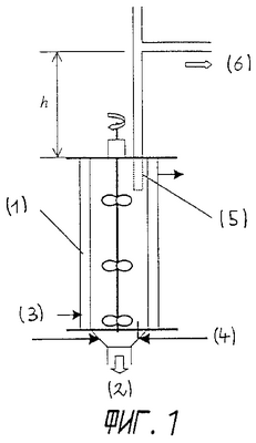 Предпочтительно в устройстве для коагуляции из фиг. 1 отношение высоты к внутреннему диаметру находится в диапазоне 1-3. В составе имеются серии мешалок, собранных вдоль оси цилиндрического корпуса. Мешалки могут иметь тип аксиального, радиального или смешанного движения, но радиальное движение предпочтительно. Количество мешалок может находиться в диапазоне от 1 до 4 в зависимости от отношения высоты устройства для коагуляции к его внутреннему диаметру. Когда используется несколько мешалок, может применяться комбинация различных движений. Диаметр мешалки может находиться в диапазоне между 0,3 и 0,7 относительно внутреннего диаметра цилиндрического корпуса. Предпочтительно иметь серии перегородок в устройстве для коагуляции и в данном случае должен оставаться значительный зазор между перегородками и стенкой устройства для коагуляции. Форма дна устройства для коагуляции может быть произвольной, но предпочтительна коническая форма, поскольку она позволяет легко выгружать материал из устройства для коагуляции после коагуляции. В верхней части устройства для коагуляции предоставляется фильтр (5), чтобы микросферы фторполимера удерживались бы внутри устройства для коагуляции и не уносились с водой при работе устройства для коагуляции. Выше фильтра устанавливают вертикальную трубу, где столб жидкости может постепенно регулировать давление в устройстве для коагуляции в течение коагуляции. Однако такой способ регулирования давления можно заменить прибором для управления давлением. Высота вертикальной трубы h равна между 0 и 5 метрами.
