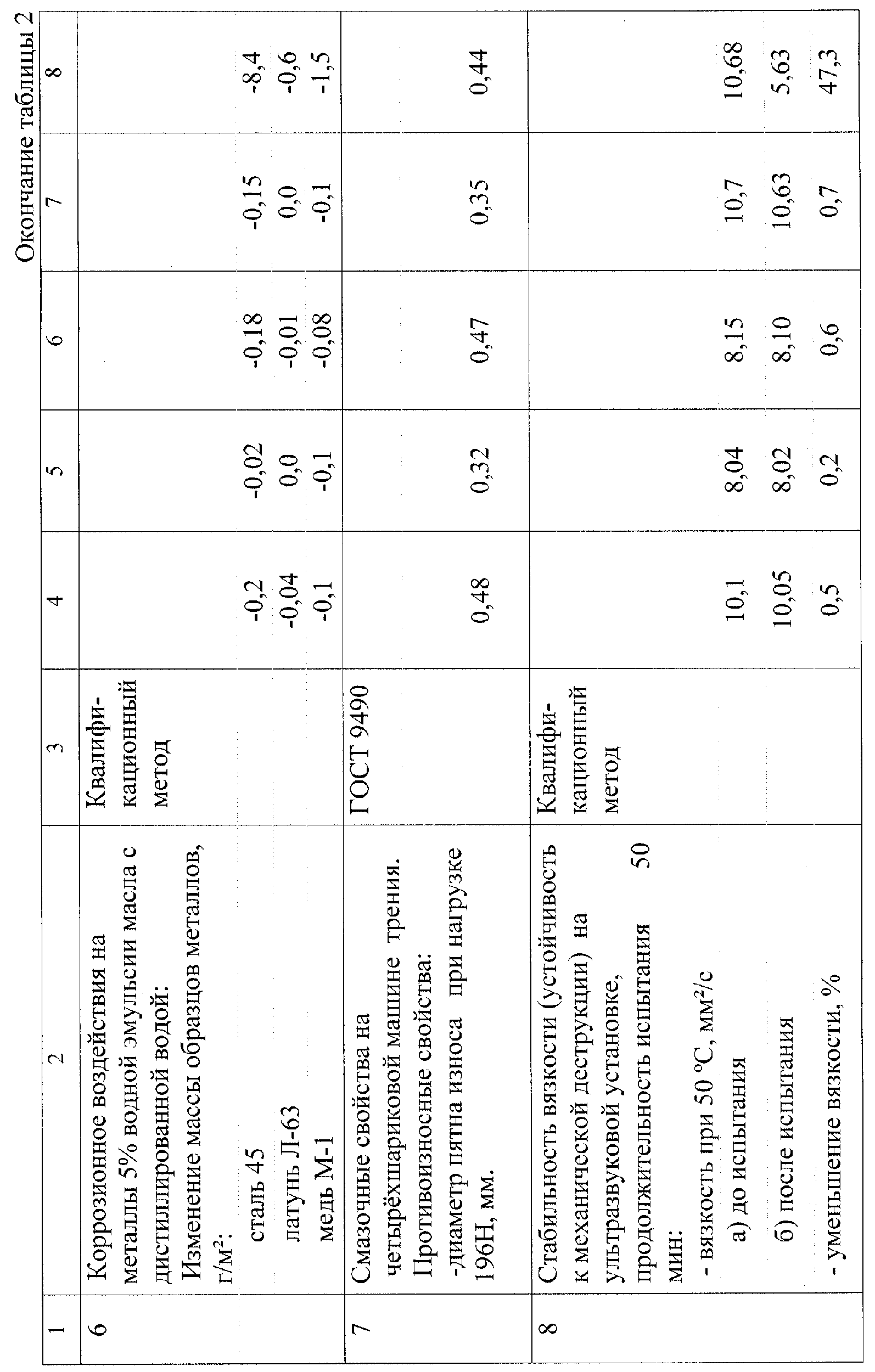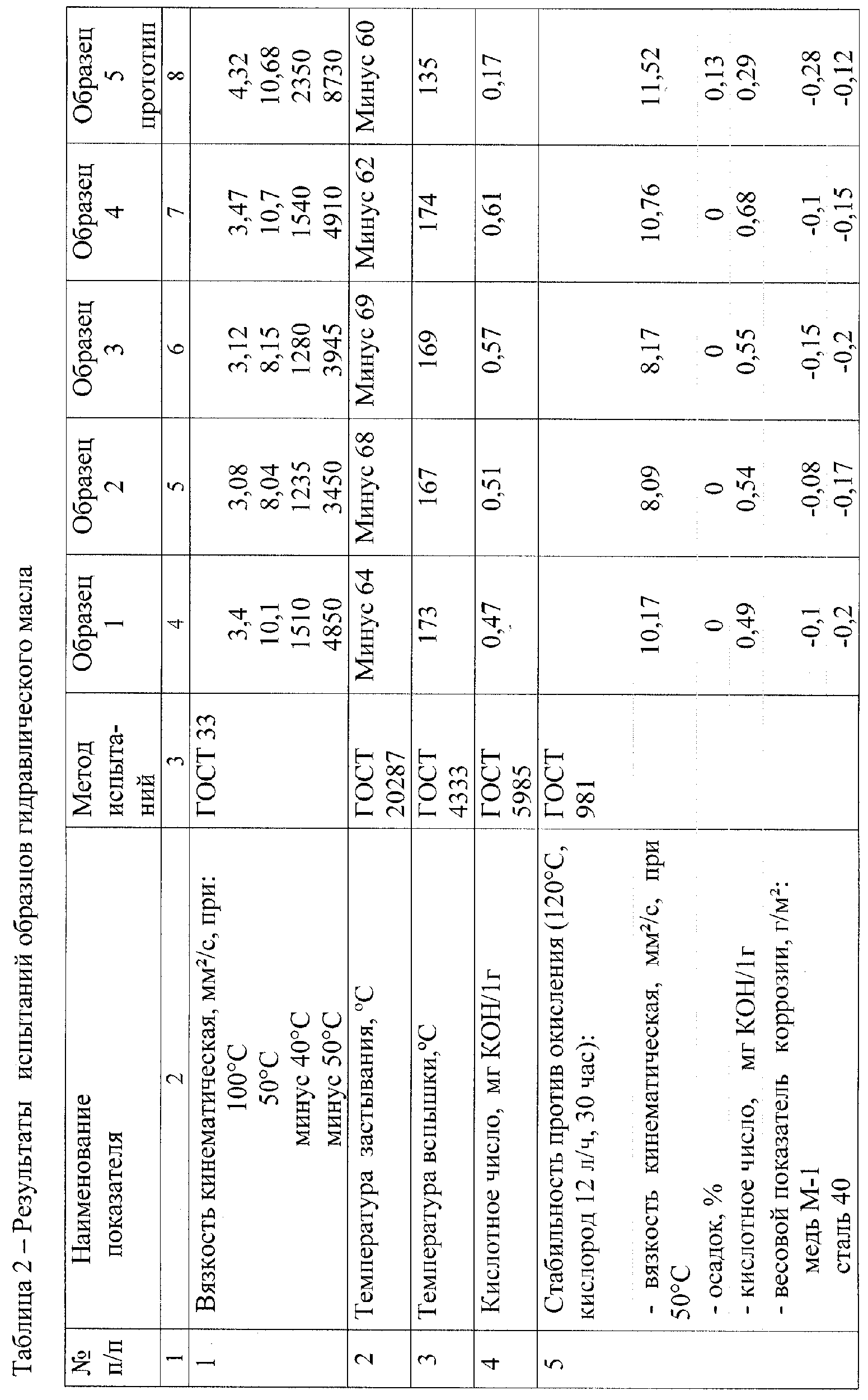 Для приготовления образцов использовались товарные сырьевые компоненты: – полиальфаолефины с вязкостью 1,7-2,0 мм2/с при 100°С – масло базовое полиальфаолефиновое ПАОМ-2 ТУ 0253-004-54409843; – полиальфаолефины с вязкостью 3,7-4,3 мм2/с при 100°С – масло базовое полиальфаолефиновое ПАОМ-4 ТУ 0253-004-54409843; – присадка Агидол-1 (4-метил-2,6-ди-трет-бутилфенол) ТУ 38.5901237-90; – присадка Неозон “А” (фенил- – трикрезилфосфат технический ГОСТ 5728; – присадка ВСП ТУ 38.101811-83; – продукт КАП-25 ТУ 6-17-04-60-88; – полиметилсилоксановая жидкость – присадка ПМС-200А ОСТ 6-02-20-79. Образцы испытаны по основным показателям, оценка которых является обязательной при квалификационных испытаниях рабочих жидкостей для гидравлических систем специальной, морской, строительно-дорожной и сельскохозяйственной техники (Комплекс методов квалификационной оценки рабочих жидкостей для гидравлических систем специальной, морской, строительно-дорожной и сельскохозяйственной техники, утвержден Межведомственной комиссией по допуску к производству и применению топлив, масел, смазок и специальных жидкостей при Госстандарте России 21 ноября 1996 г., протокол №4). Оценка устойчивости жидкости к механической деструкции при механо-динамических нагрузках проводилась квалификационным методом на ультразвуковой установке в условиях акустической кавитации. Результаты испытаний представлены в таблице 2. Из сравнения результатов испытаний видно, что гидравлическое масло предложенного состава (образцы №1-№4) не уступает маслу-прототипу по вязкостно-температурным характеристикам (п.1, 2, табл.2), стабильности против окисления (п.5, табл.2) и существенно превосходит по устойчивости к механической деструкции (п.8, табл.2) – вязкость масла стабильна при механо-динамических нагрузках. Заявленное масло коррозионно-неагрессивно при воздействии на металлы 5% водной эмульсии масла (п.6, табл.2) – коррозия стали не превышает 0,18 г/м2 по сравнению с 8,4 г/м2 для прототипа. Применение изобретения позволит увеличить ресурс работы масла в гидросистемах техники не менее чем в 2 раза, повысит надежность работы гидроагрегатов за счет существенного уменьшения коррозии металлов в контакте с маслом в случае его увлажнения.