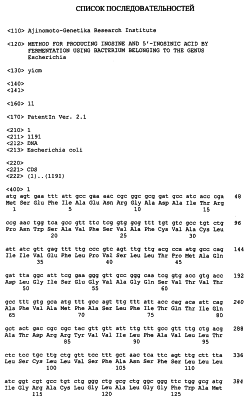 Данная цель была достигнута путем установления того факта, что ген yicM, предположительно кодирующий мембранный белок, придает устойчивость к аналогу пуриновых оснований, 6-меркаптопурину и к пуриновым нуклеозидам, таким как инозин и гуанозин, в случае, когда природный аллель указанного гена введен в клетки штамма на многокопийной плазмиде. Белок YicM, кодируемый геном yicM, не вовлечен в путь биосинтеза пуриновых нуклеотидов и принадлежит к надсемейству транспортных белков (Рао, S.S. et al, Microbiol. Mol. Biol. Rev., 62 (1), 1-34, (1998)). Более того, ген yicM может увеличивать продукцию нуклеозидов в случае, когда его дополнительные копии введены в клетки соответствующих продуцентов инозина, принадлежащих к роду Escherichia. Таким образом было совершено настоящее изобретение.