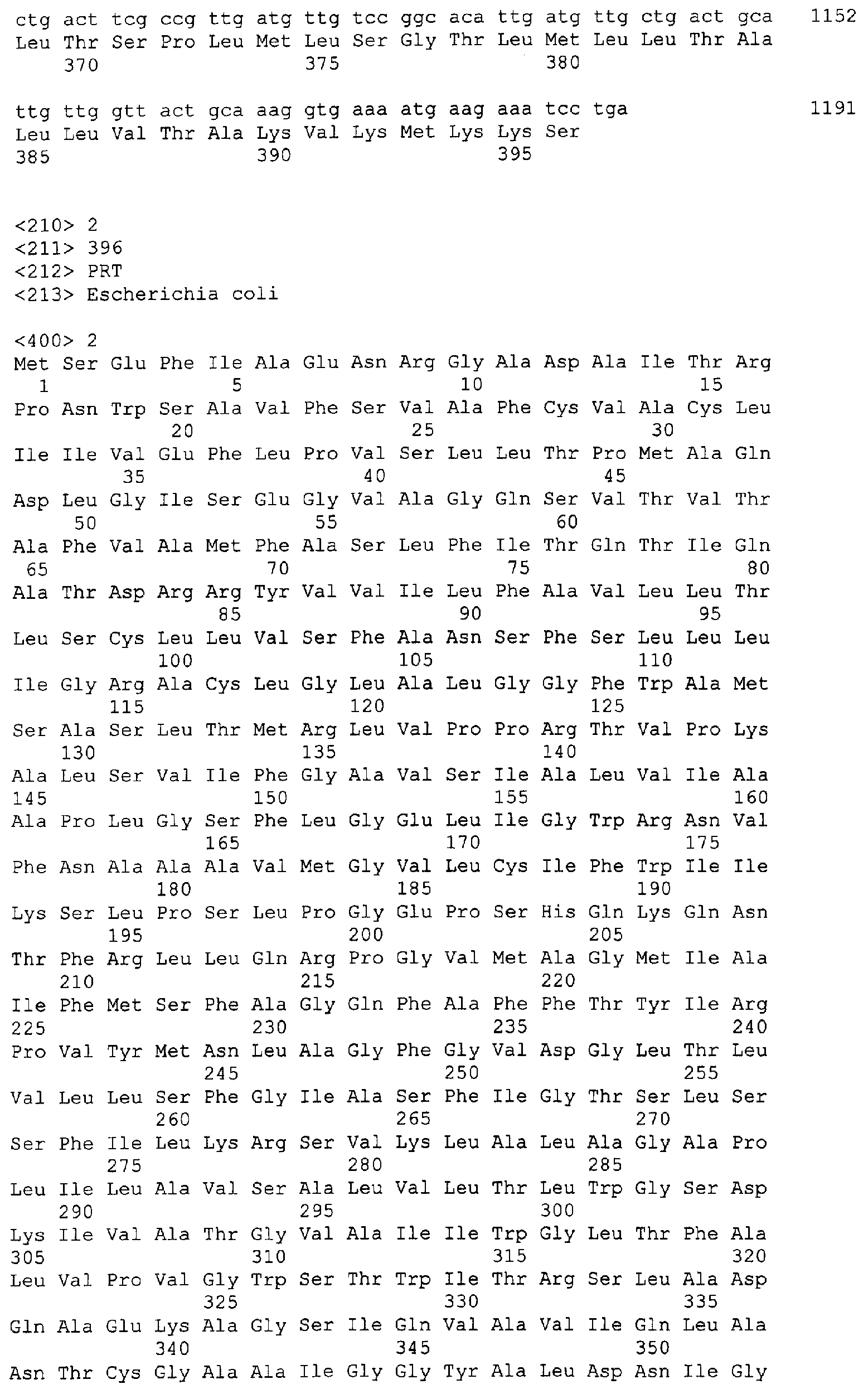 Белок, который представлен аминокислотной последовательностью, приведенной в списке последовательностей под номером 2, является белком YicM. Белок YicM не вовлечен в путь биосинтеза пуриновых нуклеотидов и принадлежит к большому надсемейству транспортных белков MFS (MFS – major facilitator superfamily) (Pao, S.S., et al, Microbiol. Mol. Biol. Rev. 62 (I): 1-32, (1998)) и к кластеру ортологов пермеаз экспорта арабинозы (COG – cluster of orthologous group) 2814 (Tatusov, R.L. et al, Nucleic Acids Res., 29: 22-28 (2001)). Другими белками, принадлежащими к этому семейству в Е. coli, являются белки AraJ and YdeA, осуществляющие транспорт арабинозы из клетки (Bost, S. et al, J. Bacteriol., 181:2185-2191 (1999)), и белок YdhP. Геном Bacillus subtilis содержит 6 генов, кодирующих гомологи гена yicM: ybcL, yceJ, ydhL, yftil, ytbD, ywfA. Белок YicM из штамма Е. coli К-12 является высокогидрофобным белком, состоящим из 396 аминокислот, содержащим 12 предполагаемых трансмембранных сегментов и обладающим неизвестной функцией. Белок YicM кодируется геном yicM. Ген yicM из штамма Е. coli К-12 (нуклеотиды с 3838176 по 3839366 в последовательности с инвентарным номером NC_000913; gi: 16127994 в базе данных GenBank) расположен в хромосоме Е. coli между генами nlpA и yicN на 82.73′.
