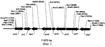 Фрагмент 6-МР1 содержал по крайней мере 8 генов. Для того, чтобы идентифицировать ген, придающий устойчивость к 6-меркаптопурину, инозину и гуанозину, каждый из генов был субклонирован в многокопийный вектор рОК12 (Vieira, Messing, Gene, 100,189-194,1991) и проверен на способность придавать устойчивость к указанным реагентам. Среди них ген yicM, содержащий примерно 342 п.о. перед предполагаемым старт-кодоном (последовательность Genbank, инвентарный номер NP_418118), был вырезан из фрагмента 6-МР1 с использованием ферментов рестрикции PstI и PvuII и вставлен в вектор рОК12 (Vieira, Messing, Gene, 100, 189-194, 1991), предварительно обработанный ферментами рестрикции PstI и Есо32I. Так была получена плазмида pYICM1, содержащая ген YicM (Фиг.2).