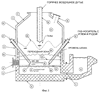 Печь оборудована проходящей вниз фурмой 26 для вдувания горячего воздуха, предназначенной для подачи горячего воздушного дутья в верхнюю область емкости.