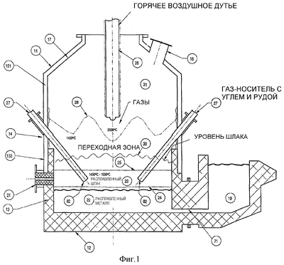 В дополнение к описанному выше горячий воздух, вдуваемый при температуре 800-1400°С через фурму 26, дожигает реакционные газы СО и H2 в переходной зоне 28 и повышает температуру до 2000°С или выше в газовом пространстве. Это тепло передается поднимающимся и опускающимся всплескам, каплям и брызгам расплавленного материала в области вдувания газа, а затем тепло частично передается по всей ванне расплава.