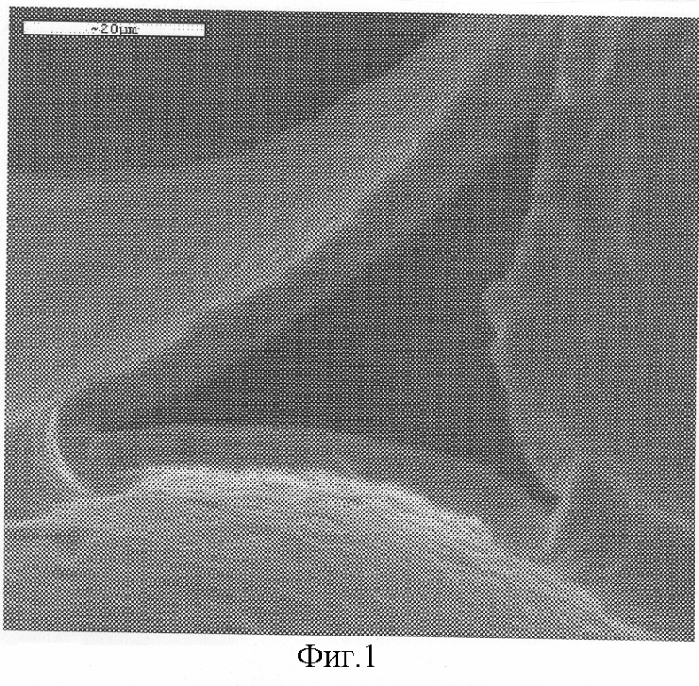 Потребители пеноникеля, используемого в аккумуляторной, химической промышленности и в других отраслях, предъявляют к нему комплекс требований, в т.ч. требование к поверхностной плотности – массе одного квадратного метра материала. Диапазон поверхностной плотности пеноникеля колеблется в пределах от 250 до 650 г/м2. Такой величине поверхностной плотности соответствует толщина никелевого слоя приблизительно 5 мкм, как это видно из микрофотографии фиг.1. Характерный вид тяжа представлен на фиг.2.