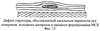 Значительное влияние на физико-механические свойства конденсатов оказывают дефекты структуры материала, вызванные: а) возможным краткосрочным отключением высокого напряжения в процессе выпаривания исходных материалов (фиг.10); б) капельным переносом при формировании разделительного слоя (фиг.11), капельным переносом исходных (испаряемых) материалов (фиг.12, 13). Наиболее опасными являются дефекты, которые возникают на начальных этапах, то есть при формировании разделительного подслоя (фиг.11) и в первые минуты формирования, собственно микрослоистого материала (фиг.12). На микрокаплях, образованных при осаждении разделительного слоя (например, при выпаривании CaF2) или микрокаплях, образованных на подложке в начальный момент выпаривания исходных материалов (подобное явление наблюдается в случае окисления жидкой ванны выпариваемого материала, наличия газов неметаллических включений в исходных (выпариваемых) слитках, частичной диссоциации образующихся на поверхности жидкой ванны оксидов, карбидов, боридов при их выпаривании) формируются иглообразные стрежни (фиг.10, 11), практически не связанные с основным материалом по всей высоте конденсата. Указанные стержни являются причиной быстрого разрушения материала при минимальных механических нагрузках.