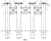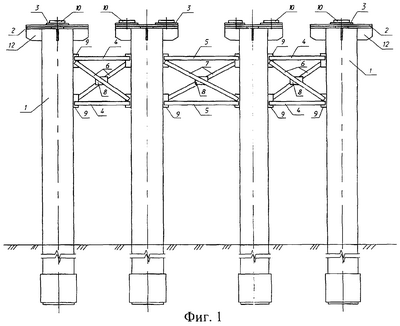 Стальные сваи 1 погружаются в грунт при помощи дизель-молота. После погружения в грунт на необходимую глубину и выравнивания под верхнюю проектную отметку газовым резаком на свае 1 устанавливаются поперечные связи 4 и 5, собираемые из отдельных элементов, затем устанавливаются насадки 2. Для этого в трубах в их верхней части делаются вертикальные прорези на высоту ребер 12 насадки 2, в которые она и устанавливается. Сверху на насадку крепятся при помощи высокопрочных болтов подферменники 3, в виде стального листа, к которым сваркой крепятся опорные части 10 каткового типа. Диагональные связи 6 и 7 и поперечные связи 4 и 5 жестко закреплены своими концами на фасонках 9. Фасонки 9 через демпфирующие элементы 11 установлены на сваях 1. Диагональные связи 6 и 7 связаны между собой прокладками 8.