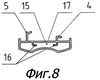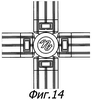 Соединение модулей под углом один к другому показано на фиг.4, 5 и 6. Модули соединяются между собой при помощи основных стоек 3, дополнительных стоек 12 и держателей 13. Дополнительные стойки могут быть выполнены в виде труб, сопрягаемых с ответными дугообразными поверхностями 14, которые при помощи внешних г-образных направляющих ребер 4 и 5 соединены с основными стойками. Боковые проемы соединенных основных стоек и держателей образуют открытые наружу т-образные пазы 9, в которых размещаются крепежные средства – сухари 10 и винты 11 для фиксации соединений “основная стойка-держатель”.