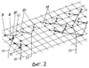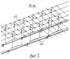 Пролетная часть образуется из перекрестно растянутых канатов 2 с анкерным креплением 3. Кроме того, на крыше многоячеистая сетка образуется из чередующихся канатов и жестких (металлических, деревянных и прочих) стержней 4, которые также определенным образом крепятся и к боковой стене. Эти стержни образуют прочный край контура строения, если их изогнуть под углом 90°. Затем крышный и боковой навстречу друг другу уложить, предварительно сварив их общие части 4. На фигуре 1 это выделено жирными линиями.