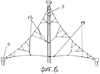При строительстве зданий гражданского или производственного назначения нужно использовать элементы, объединенные в 8, 16 и более ячеек, как схематично показано на фигурах 2, 4, 5, 6. При этом крайние свободные концы 12 оттяжек должны крепиться так, чтобы точка крепления была по отношения к закрепляемой поверхности крыши близкой к 90°. Нижней точкой крепления оттяжки может служить анкерная схема 13 (фиг.3), если это строение с прозрачной кровлей, например теплица; канаты 14 (фиг.4, 5); элементы контура 5, 6 (фиг.5, 6).