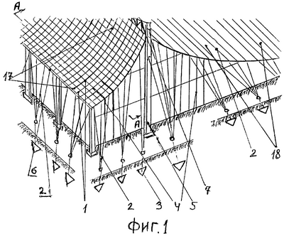 Традиционно считается, что сетка – это то, что образовано из одного типа пересекающихся элементов. В моем техническом решении сетка состоит из чередующихся между собой канатов и жестких (из металла или деревянных реек) стержней. Такое чередование позволяет не только удешевить стоимость такой конструкции, поскольку трос дороже металлического стержня или деревянной рейки, но жесткие стержни позволяют придать висячей конструкции дополнительную жесткость и надлежащую форму. Причем нижний ряд 18 сетки (фиг.1) натягивается вдоль тросовой фермы 7 (конька крыши), состоит из одних только канатов (металлических тросов), а верхний – из канатов 2 и жестких стержней 17, натянутых поперек конька на обе его стороны.