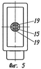 Внутри полости корпуса 3 размещен сепаратор 8, подпружиненный со стороны крышки 4 с помощью пружины 9. В крышке 5, сепараторе 8, имеющем переднюю 10 и заднюю 11 стенки, и крышке 4 выполнены соосные отверстия соответственно 12, 13 и 14. При этом устройство снабжено насадкой, выполненной в виде кольца 15 по меньшей мере с двумя симметричными диаметрально расположенными выступами 16, смонтированного с возможностью вращения на сепараторе 8 со стороны передней стенки 10 посредством буртика 17, выполненного на кольце 15, и кольцевой проточки 18, выполненной на сепараторе. Кольцо 15 может быть выполнено из любого синтетического материала с низким коэффициентом трения, но имеющим хорошую стойкость к износу. Благодаря повышенной способности к упругой деформации, которую имеют такие материалы, кольцо надевают на сепаратор с некоторым усилием. После западания буртика 17 в кольцевую проточку 18 на сепараторе кольцо легко вращается на сепараторе. Расстояние между выступами (lвыс) равно или немногим меньше расстояния между противоположно расположенными впадинами (lвп) троса, т.е. lвыс lвп. Выступы 16, таким образом, практически полностью перекрывают радиальный зазор между тросом 1 и отверстием в кольце 15 на сепараторе 8 и тем самым предотвращают проникновение какого-либо предмета к роликам 19. Т.е. исключается возможность проникновения предметов небольшой толщины, но сравнительно достаточной жесткости между тросом и образующими поверхностями выступов, а следовательно, между тросом и роликами. В обратном случае указанные предметы, воспринимающие нагрузку роликов, освобождают трос от проникновения в его пряди роликов, и при неоднократном подергивании запирающего механизма с последующей прокруткой не исключается возможность скручивания запирающего механизма с троса.