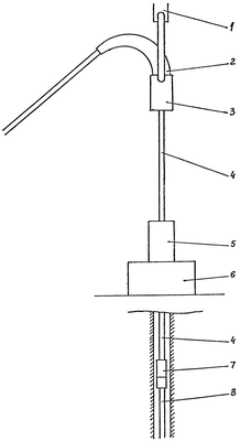 Разбуривание продуктивных отложений предлагаемой компоновкой бурильной колонны осуществляется следующим образом (вариант). Перед вскрытием продуктивных отложений скважину оборудуют легким буровым станком (например, А-50) и колтюбинговой установкой с намотанным на барабан фрагментом БДГТ необходимой длины, при этом верхний конец гибкой трубы закреплен на барабане и имеет гидравлическую связь с системой закачивания промывочной жидкости в скважину. На устье скважины монтируется инжектор и герметизатор (на схеме не показан). Инжектор служит для затаскивания нижнего конца БДГТ от барабана по технологическому тракту к устью скважины, центровки БДГТ, относительно оси скважины, удержания БДГТ при движении клинового элеватора относительно гибкой трубы. Герметизатор обеспечивает уплотнение БДГТ в процессе бурения на депрессии всего необходимого интервала. Бурильная колонна, состоящая из замковых труб, наращивается гибким хвостовиком 4 посредством стыковочной муфты 7, не требующей взаимного вращения соединяемых труб. При бурении бурильная колонна (гибкий хвостовик с подвешенной на ней колонной замковых труб и забойным инструментом) удерживается на весу талевой системой с помощью клинового элеватора 3, расположенного на некотором расстоянии над ротором. По мере углубления скважины при разгружении части веса бурильной колонны на забой и дохождения клинового элеватора до ротора бурильная колонна перевешивается на клинья ротора, а клиновой элеватор, освобожденный от веса бурильной колонны, приподнимается на определенную высоту и на него снова перегружается бурильная колонна, после чего бурение продолжается.