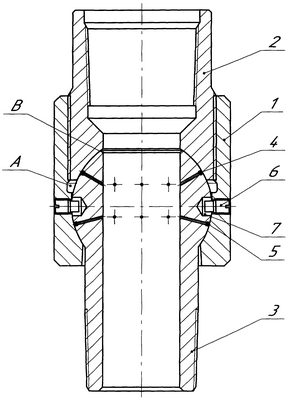 На чертеже изображена муфта соединительная насосно-компрессорных труб. Муфту соединительную насосно-компрессорных труб располагают сразу после установки погружного центробежного насоса, а также между трубами НКТ, в местах интенсивного искривления обсадной колонны (скважины). Муфта соединительная содержит корпус 1, неподвижную полумуфту 2, подвижную полумуфту 3, уплотнительные кольца 4 и 5, установочные винты 6 в корпусе 1 и глухие гладкие отверстия 7, выполненные диаметром с возможностью перемещения подвижной полумуфты в азимутальной плоскости, не препятствуя ее угловому перемещению относительно поперечной оси. Кольцевое пространство А между корпусом и сферическими поверхностями полумуфт при сборке заполняют графитовой смазкой, обеспечивая улучшение антифрикционных свойств материала муфты соединительной и предотвращая износ контактируемых поверхностей. Фаска В в верхней части подвижной полумуфты предотвращает «зацепы» при проведении геофизических и ремонтных работ (разрушение сбивного клапана) в НКТ.