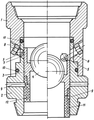 Разъединительный переходник содержит составной корпус, состоящий из верхней и нижней частей 1 и 2 соответственно, и седло 3 под бросовый шаровой клапан 4. Верхняя и нижняя части 1 и 2 корпуса соединены между собой посредством шарового затвора 5, размещенного в совмещенных радиальных каналах 6 и 7 соответственно верхней и нижней частей 1 и 2 корпуса и зафиксированного в исходном положении с наружной стороны резьбовой пробкой 8, а с внутренней стороны – седлом 3 клапана 4. Седло 3 имеет наружный диаметр меньше внутреннего диаметра корпуса по всей его длине. Радиальные каналы 6 и 7 корпуса выполнены наклонными от наружной поверхности в сторону его нижнего торца, что обеспечивает гарантированное срабатывание шарового затвора 5. Резьбовая пробка 8 выполнена полой. В рабочем положении седло 3 фиксируется относительно нижней части 2 корпуса срезным элементом 9. Разъединительное устройство снабжено уплотнениями 10 и контейнером 11, который разъемно соединен с нижней частью седла 3 клапана 4. Контейнер 10 выполнен из легкого материала с целью обеспечения “плавучести” седла 3 вместе с клапаном 4 и шаровым затвором 5. Это означает, что после срабатывания устройства седло 3 вместе с клапаном 4 и шаровым затвором 5 должно всплыть на поверхность. С этой целью все указанные элементы выполняются из материала, удельный вес которых меньше удельного веса промывочной или продавочной жидкости, а контейнер 10 может выполняться с полостью 12 (показана пунктиром), заполняемой пенопластом, газом или другим материалом с малым удельным весом. В зависимости от условий эксплуатации каждое уплотнение 9 может содержать одно или несколько колец из соответствующего материала, обеспечивающих надежную герметизацию корпуса разъединительного устройства. Количество шаровых затворов 5 также выбирается в зависимости от условий работы.
