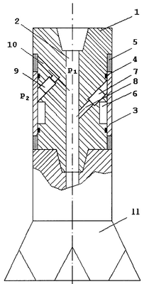 В составе бурильной компоновки устройство спускается в интервал бурения. В статическом режиме, когда давления внутри трубы и в затрубье одинаковы, производится измерение давлений датчиками 8 и 9 внутри трубы и в затрубье соответственно. Пусть давление, измеренное внутри трубы, равно P1с, a давление, измеренное в затрубье, равно Р2с. При этом P1с>Р2с и считается, что P1с – истинное давление, определяется Рс=P1с-Р2с. В динамическом режиме, когда идет бурение, P1>Р2. Пусть давление, измеренное внутри трубы, равно Р1д, а давление, измеренное в затрубье, равно Р2д. При этом дифференциальное давление будет равно Рд=Р1д-(Р2д+ Рс). В случае, когда за истинное давление принимается Р2с, то – Рс=Р2с-P1с, при этом дифференциальное давление будет равно Рд=Р1д-(Р2д– Рс). Если P1с<Р2с и считается, что P1с – истинное давление, то – Рс=P1с-Р2с. При этом дифференциальное давление будет равно Рд=Р1д-(Р2д– Рс). В случае, когда за истинное давление принимается Р2с, то Рс=Р2с-P1с, при этом дифференциальное давление будет равно Рд=Р1д-(Р2д+ Рс). Все измерения и вычисления производятся электрическими схемами, расположенными в выемках 6 корпуса 1.