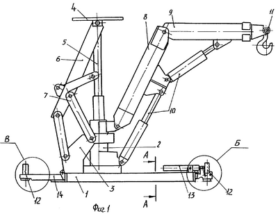 В боковых полостях 15 рамы 16, принадлежащих основанию 1, двигаются балки 14. На передних концах балок 14 имеются кронштейны 17 с осями 18 для крепления штоковой полости гидроцилиндров передвижения 13. Поршневые части закреплены в кронштейнах 19 осями 20, расположенными на верхней плоскости основания 1.