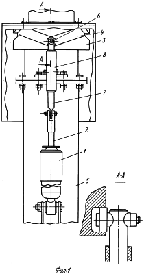 Изображенный на фиг.1 демпфер рыскания ветроколеса содержит как минимум один гидравлический амортизатор 1 (для обеспечения наилучших условий эксплуатации их может быть несколько) и устройство преобразования вращательных движений гондолы ветроколеса в поступательное движение поршня 2 гидравлического амортизатора 1. Гидравлический амортизатор 1 выполнен, например, по типу автомобильного и содержит цилиндр с гидрожидкостью (на чертеже не обозначен), размещенный в нем поршень 2 с дросселем (на чертеже не приведен). Устройство преобразования выполнено в виде расположенного на опорно-поворотном узле 3 гондолы ветроколеса зигзагообразного паза 4. При этом гидравлический амортизатор 1 одним концом закреплен на башне 5, а вторым взаимодействует с устройством преобразования – в данном случае через размещенный в пазе 4 ролик 6 и тягу 7, расположенную в направляющей 8.