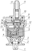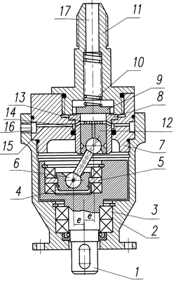 Вращение от приводного вала 1, расположенного в корпусе 2 на подшипниках 3, передается на шатун со сферическими опорами 6, установленный эксцентрично на шаровой втулке 4 и подшипниках 5. Вращение шатуна 6 вокруг оси приводного вала преобразуется в поступательное движение поршня 12. При движении поршня 12 из нижней мертвой точки перекрываются радиальные отверстия 13 и запертый объем жидкости, перемещаясь вместе с поршнем 12, воздействует на клапан 9. Последний сжимает пружину 10 и жидкость поступает в нагнетательный канал 17.