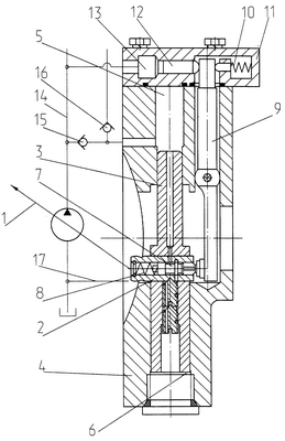 Рост давления в линии высокого давления 14 приводит к росту давления в штоковой полости 5 дифференциального поршня 3 и соответственно в камере управления 13 плунжера 12. Плунжер 12 воздействует на плечо рычага 9, возникающее усилие на рычаге перемещает золотник 7, который при этом соединяет поршневую полость 6 с дренажным каналом 17. Гидромашина устанавливается на максимальный рабочий объем.
