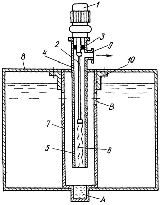 При включенном насосе ротор 6, вращаясь внутри статора 5, засасывает жидкость из резервуара 8 на вход насоса через радиальные отверстия В стакана 7, а далее через насос (ротор 6 – статор 5) в трубопровод (не показан) потребителю. Очистка от осевших механических примесей производится из накопительной камеры А стакана 7 вручную, или механическим, или гидравлическим способом.
