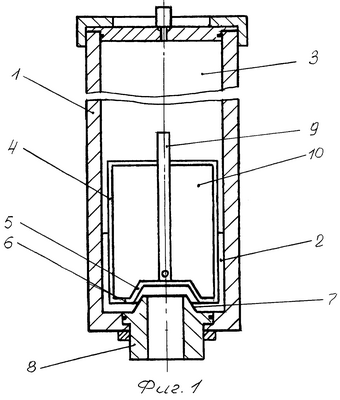 Отсутствие деформации тонкостенного разделителя 4 под действием перепада давления обеспечивается сообщением его внутренней полости 10 с газовой полостью 2 через трубку 9.