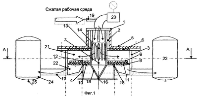 В режиме генерации ударных потоков на электромагнитный привод вентиля 20 подается короткий электрический сигнал, и вентиль 20 открывается. Сжатая рабочая среда из распределительной камеры 1, цилиндрической обечайки 13 и управляющей камеры 21 через продольные щели 14 цилиндрической обечайки 13 и промежутки между направляющими ребрами 2 распределительной камеры 1 устремляется к вентилю 20 и через него выбрасывается в атмосферу. В результате над клапаном 7 происходит резкое падение давления рабочей среды. За счет усилия, создаваемого перепадом давления рабочей среды в управляющей камере 21 и переходной камере 22, клапан 7 мгновенно смещается вверх, и вход сопла 4 открывается. Потоки сжатой рабочей среды из ресиверов 24, размещенных по периметру вокруг корпуса 3, через патрубки 17 направляются в переходную камеру 22. В ней конусный направляющий элемент 15 предохраняет эти потоки от встречных ударов, вызывающих потерю энергии, и направляет их в сопло 4, где из них формируется общий поток рабочей среды. В результате на выходе из сопла 4 образуется мощный ударный поток рабочей среды малой длительности, который направляется на объект воздействия. После выброса рабочей среды из сопла 4 вентиль 20 автоматически закрывается. Клапан 7 ударяется об эластичный амортизатор 6 крышки 5 корпуса 3 и под воздействием давления рабочей среды, постоянно подаваемой по штуцеру 19, и собственной массы опускается вниз в исходное положение. Генератор готов к новому циклу работы. Периодически из конусообразного направляющего элемента 15 через вентиль 16 и из ресиверов 24 с помощью крана 25 удаляется влага.