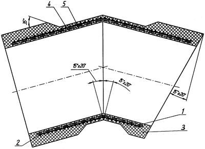 Объемный армированный каркас для соединений выполняют из того же материала и таким же диаметром, что и объемный армированный каркас для труб: из равномерно расположенных по окружности продольных элементов 4 арматуры, и навитых на них с заданным шагом спиральных элементов 5, сваренных в местах их пересечения точечной сваркой. Готовый каркас разрезают на отрезки заданной длины по торцевым поверхностям и сваривают между собой под углом 0 <90°. Угол определяется направлением трассы трубопровода. Полученный усилитель прочности помещают в пресс-форму термопластавтомата заданных размеров и с углом поворота оси . Заполняют пресс-форму расплавленным полимером и после охлаждения получают неразъемное соединение в виде отвода с соответствующим углом поворота и с законцовками. Комбинация таких отводов позволяет получить любое изменение направления трубопровода. В зависимости от марки полимера, образующего монолит трубы, выбирается и материал для неразъемного соединения.