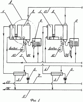 1. Способ автономного теплоснабжения, включающий в себя нагрев оборотной воды в водогрейном газовом котле, подачу ее в систему отопления, утилизацию тепла уходящих дымовых газов в теплообменнике, нагретый воздух из которого подают в топку котла, отличающийся тем, что газовый котел работает под наддувом в пульсирующем режиме, при котором происходят дальнейшие процессы тепломассообмена, частично охлажденные дымовые газы смешивают с озоном и кислородом, выделившимся из насыщенного конденсата, охлаждают их до температуры ниже температуры конденсации находящихся в них водяных паров с образованием пленки свежего конденсата, который смешивается с насыщенным конденсатом, стекающим из распределительных лотков, на стенках газовых каналов пластинчатого конденсатора, при движении дымовых газов сверху вниз в противотоке с нагреваемым через стенку дутьевым воздухом и контакте с пленкой конденсата, также стекающей сверху вниз, параллельном протекании химических реакций окисления в газовой и жидкой фазах окиси азота (NO) в легкорастворимую двуокись азота (NO2), которая легко абсорбируется конденсатом с образованием азотной кислоты (HNO3), после чего насыщенный кислотными компонентами кислый конденсат стекает в карман сбора кислого конденсата, одна часть его, достаточная для проведения процесса абсорбции окислов азота, поднимается по подъемной трубе эрлифта в виде газожидкостной эмульсии, образованной в результате смешения с озоновоздушной смесью, по пути насыщаясь озоном и кислородом, с образованием насыщенного конденсата, который поднимается в карман сбора насыщенного конденсата и через распределительные лотки стекает вниз с одновременной десорбцией части озона и кислорода, смешиваясь со свежим конденсатом, а другая часть кислого конденсата стекает в поддон для очистки конденсата секции очистки, куда поступают и охлажденные дымовые газы, двигаясь снизу вверх между параллельными рифлеными перфорированными пластинами, покрытыми слоем гашеной извести (Са(ОН)2), с которой происходят химические реакции оставшихся в дымовых газах окислов азота (NOx), капель кислого конденсата, двуокиси углерода (СО2) с образованием нитрита кальция (Ca(NO)2), углекислого кальция (СаСО3), нитрата кальция (Са(NO3)2), после чего очищенные от большей части вредных примесей дымовые газы сепарируются от уносимых капель конденсата и выводятся в атмосферу, а конденсат, накапливаемый в поддоне, смешивают с раствором гашеной извести (Са(ОН)2) в количестве, достаточном для связывания кислых компонентов и двуокиси углерода, растворенных в кислом конденсате, в результате чего там образуется нитрат кальция (Са(NO3)2 и нерастворимый углекислый кальций (СаСО3), находящиеся в конденсате в виде шлама, после чего прореагировавший конденсат выводят из блока очистки, очищают от шлама путем его осаждения и подают на подпитку системы отопления.