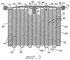 Один участок, обозначенный позицией 52, является выходным участком и расположен сбоку со стороны пластины 54, вставленной между двумя серпантинными ребрами 50. На верхнем конце выходной участок 52 изогнут коленом 56 на примерно 90 градусов для того, чтобы быть протянутым к выходной части зажимного приспособления 32 так, чтобы конец 42 трубы 34 находился в жидкостном взаимодействии с выходной частью зажимного приспособления 32. Эта секция трубы 34, обозначенная позицией 58, находится в контакте с коленами 48 на примыкающей стороне испарителя и располагается выше по течению относительно выходной части зажимного приспособления 32. Труба 36 является зеркальным отображением трубы 34, снабжена пластиной 54 и секцией 58 выходной части, поперечной для участков 46 и им подобных. Фактически труба 36 может быть выполнена одинаковой с трубой 34 и только перевернута на 180 градусов. Поскольку трубы 34 и 36 идентичны, на фигурах каждая труба 34 и 36 будет иметь такое же число участков 46, как другая. Необходимо заметить, что если потребуется, то одна из труб 34 или 36 может иметь большее число участков, чем другая.