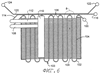 Как показано на Фиг.7, первая секция трубы 102 заменяется двумя, гидравлически параллельными секциями 130 и 132 в форме змеевиков. Обе трубы секций 130 и 132 присоединены к входной части зажимного приспособления 100, а также к зажимному приспособлению 134, которое служит входной частью трубчатого аккумулятора 136, который может быть тем же самым или подобным трубчатой конструкции 110. В этом случае аккумулятор 136 находится с одной стороны секций 130 и 132. Секция трубы 130 включает параллельные участки 136, соединяемые коленами 138, а трубчатая секция 132 включает прямые параллельные участки 140, соединенные коленами 142. В результате секции трубы 130 и 132 имеют форму змеевика, и ребра в форме змеевика 144 подходят для использования.