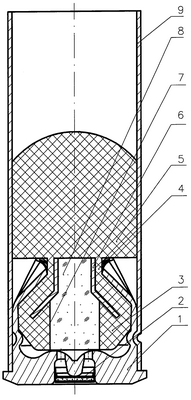 При срабатывании капсюля воспламенителя 2 газы, образующиеся в результате сгорания метательного заряда 8, создают в полости 7 давление, необходимое для разрушения перемычки 4, и выталкивают головную часть 5 через направляющую 9, при этом хвостовая часть 3 с сердечником 6 остается в гильзе 1.