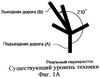 [0015] На фиг.1А показана простая схема реального перекрестка, где все дороги соединяются с подъездной дорогой, по которой приближается транспортное средство. Показано, что дороги соединяются с подъездной дорогой под различными углами, причем углы между требуемой выездной дорогой и соседними дорогами малы.