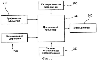[0049] Как показано на фиг.3, навигационная система с ведением по последовательным поворотам, выполненная в соответствии с настоящим изобретением, содержит картографическую базу данных 200 для хранения данных, необходимых для формирования перекрестка, графическую библиотеку 210 для хранения данных базовой стрелки, запоминающее устройство 220 для хранения таблицы тригонометрических функций и координаты стрелки, показывающей направление, центральный процессор 230 для формирования направляющей стрелки поворота для управления на перекрестке с использованием основной функции навигации, данных базовой стрелки и таблицы тригонометрических функций, и дисплей 240 с экраном для отображения перекрестка вместе с направляющей стрелкой поворота. Кроме того, система отслеживания местоположения 250 передает информацию о текущем местоположении на центральный процессор 230, который осуществляет прием информации о текущем местоположении с использованием данных от спутника GPS.