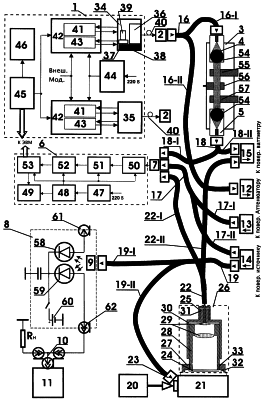 Измерительный преобразователь 8 состоит из двух фотодиодов 58 и 59: Jn-As-Ca 58 (1,3 мкм 1,5 мкм) и Si 59 (0,85 мкм) в волоконно-оптических разъемах, являющихся оптическим входом 9 преобразователя 8. Питание фотодиодов 58 и 59 осуществляется от батареи 60. Каждый фотодиод электрически связан со своим разъемом 61 или 62 соответственно, который связан с осциллографом 11 коаксиальным кабелем через коаксиальный тройник, являющийся электрическим выходом 10 устройства. К тройнику подключается согласованная нагрузка Rн 50 Ом (при контроле формы оптических сигналов малой мощности с низкочастотной модуляцией можно использовать нагрузку 1000 Ом).