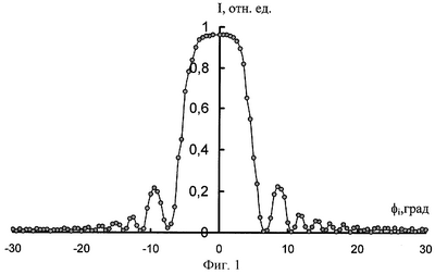 Из полученной зависимости выбирают угловой интервал в градусах по ширине центрального максимума между нулевыми значениями интенсивности, который составляет 2÷3°.