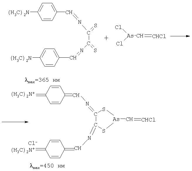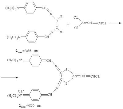 В целях экспресс-обнаружения люизита получило применение ограниченное число способов. В средствах химической разведки иностранных армий получил применение способ обнаружения люизита как в виде паров до концентрации 1·10-2 мг/л, так и в капельно-жидком состоянии на основе тиокетона Михлера (тетраметил-N,N,N’,N’-диаминотиобензофенона). При наличии паров или капельно-жидкого люизита исходный тиокетон Михлера желто-оранжевого цвета окрашивается в оливково-синий цвет [Franke S. u.a., Lehrbuch der Militarchemie, Bad 1 n 2, Berlin, 1967 г.]. Недостатком этого способа обнаружения люизита является неустойчивость тиокетона Михлера при хранении. Это соединение даже при действии кислорода воздуха постепенно окисляется в темно-синее соединение. Особенно быстро этот процесс осуществляется на свету.