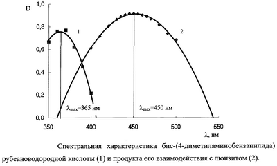 Решение поставленной технической задачи достигается применением для обнаружения капельно-жидкого люизита нового индикатора – бис-(4-диметиламинобензанилида) – рубеановодородной (тиощавелевой) кислоты. Предлагаемым индикатором в виде 1% раствора в диметилсульфоксиде пропитываются полоски фильтровальной бумаги и высушиваются на воздухе. Приготовленное индикаторное средство хранится в закрытой емкости темного стекла, которое затем может быть использовано для специфичного, контрастного и высокочувствительного обнаружения люизита в капельно-жидком состоянии. Индикаторная бумага, пропитанная предлагаемым индикатором, при контакте с капельно-жидким люизитом изменяет цвет от бледно-желтого ( max=365 нм) до красно-коричневого ( max=450 нм), устойчивого в течение многих часов. Другие токсичные химикаты, кроме паров фосгена и дифосгена, в том числе такие, как иприты, не мешают обнаружению. Мешают определению сильные окислители (хлорамины, хлорная известь) и высокие концентрации солей тяжелых металлов (ртуть, кадмий, свинец, медь, серебро, таллий).