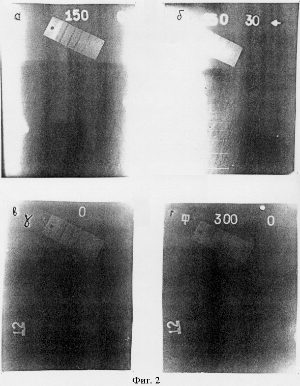 На фиг.2 представлены фотографии с рабочих и повторных радиографических снимков сварного соединения из феррит-мартенситной стали с крупнозернистой вытянутой структурой металла околошовной зоны: «а» – рабочий рентгеновский снимок при напряжении на рентгеновской трубке Up.т.=150 кВ, «б» – повторный рентгеновский снимок при Uр.т.=150 кВ с направлением просвечивания по шву под углом 30° к его нормали, «в» – повторный гамма-снимок излучением изотопа Ir192, «г» – повторный рентгеновский снимок при Up.т.=300 кВ и свинцовым фильтре толщиной dф=2 мм. На снимках «в», «г» выявлена имитированная несплошность металла околошовной зоны. На снимке «б» изображения структурного происхождения не устранены, а изображение дефекта размыто и завуалировано изображениями структуры.