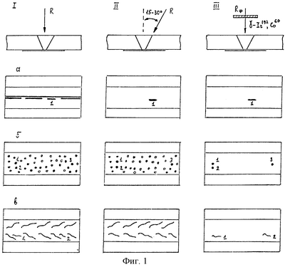 I – нормальное рентгенопросвечивание, II – рентгенопросвечивание под углом к плоскости сварного соединения, III – просвечивание фильтрованным рентгеновским излучением и гамма-излучением изотопов Ir192 и Со60.