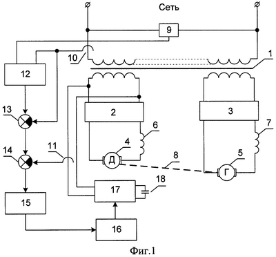 Первичная обмотка трансформатора 1 подключена к сети. Первая секция вторичной обмотки трансформатора 1 через управляемый выпрямитель 2 соединена с последовательно включенными электродвигателем 4 и первым сглаживающим реактором 6. Вторая секция вторичной обмотки трансформатора 1 через инвертор 3 связана с последовательно включенными генератором 5 и вторым сглаживающим реактором 7. Двигатель 4 и генератор 5 связаны соединительным валом 8. Первый датчик тока 10 установлен в первичной обмотке трансформатора 1, а его выход связан с первыми входами устройства вычисления входного активного тока 12 и первого элемента сравнения 13. Датчик напряжения 9 подключен к сети, а его выход подключен к второму входу устройства вычисления входного активного тока 12, выход которого связан со вторым входом первого элемента сравнения 13. Выход первого элемента сравнения 13 подключен к первому входу второго элемента сравнения 14, выход которого через последовательно включенные ПИ-регулятор 15 и широтно-импульсный модулятор 16 связан с первым входом автономного инвертора напряжения 17. Выход автономного инвертора напряжения 17 через второй датчик тока 11 подключен к первой секции вторичной обмотки трансформатора 1. Выход второго датчика тока 11 связан со вторым входом второго элемента сравнения 14, конденсатор 18 подключен ко второму входу автономного инвертора напряжения 17.