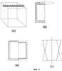 На фиг.5а-5г показаны примеры замкнутых объемов и их границ, которые могут быть охвачены датчиками при перемещении подвижной рамки: прямоугольный параллелепипед и перемещаемая по его ребрам рамка в виде бруска с двумя рядами датчиков; цилиндр или конус и вращаемая вокруг его оси П-образная рамка; цилиндр или конус и вращаемая рамка в виде смещенного прямоугольника; цилиндр или конус и вращаемая трапециевидная рамка.