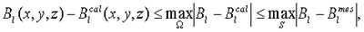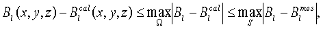 Найденные в результате решения задачи функции являются гармоническими, как и истинное решение Вl. Из-за присутствия ошибок, а именно ошибок измерения поля, ошибок установки датчиков, конечности числа измерительных точек, вычислительных ошибок, эти функции не равны. Однако их разность является гармонической функцией. В силу принципа максимального значения эта функция достигает своего максимума и минимума на границе S. Поэтому, если решение краевой задачи найдено точно, разность не превосходит ошибки магнитных измерений во всех точках объема :
