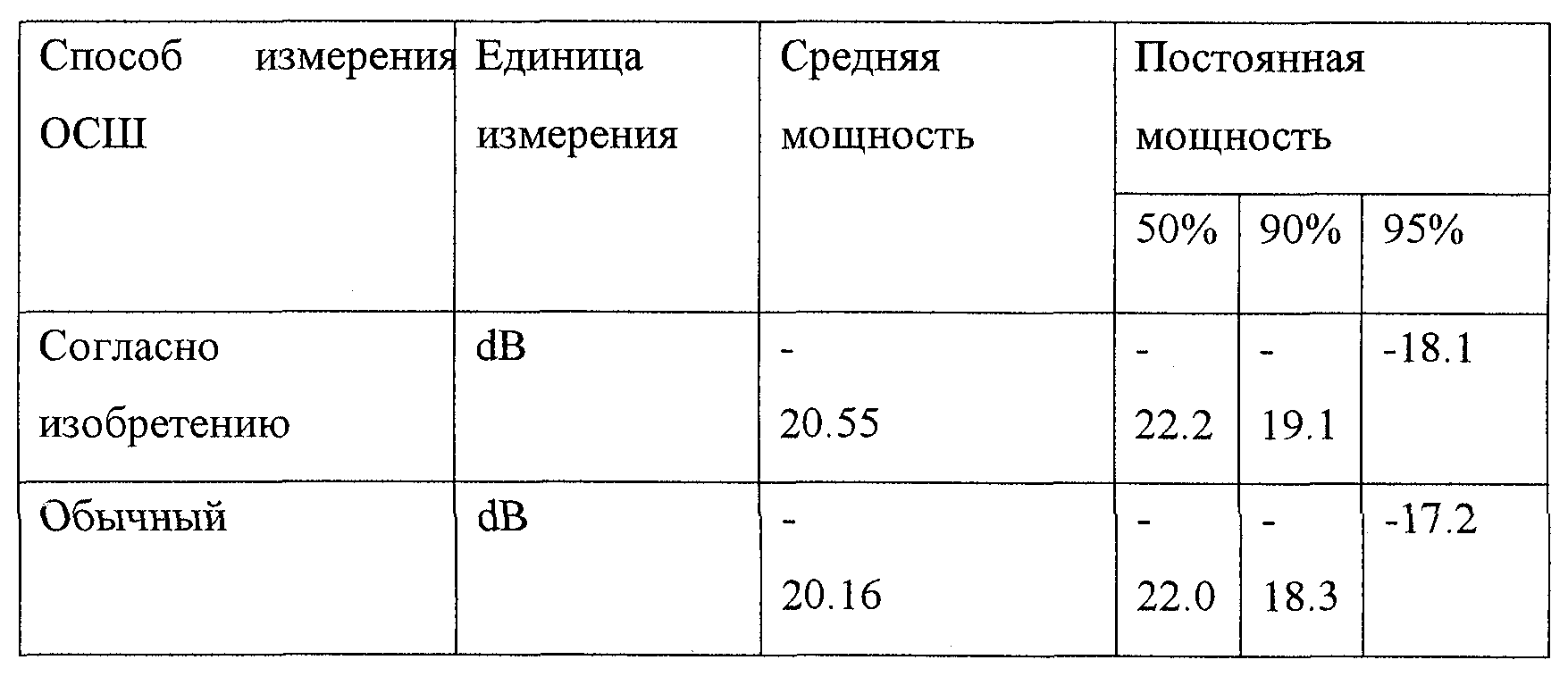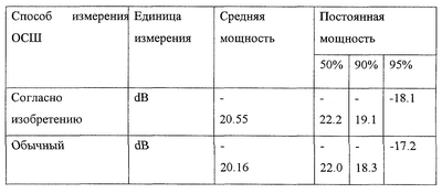 Из таблицы видно, что средняя мощность и постоянная мощность, полученные при использовании способа измерения ОСШ согласно изобретению, ниже средней мощности и постоянной мощности, полученных при использовании обычного способа измерения ОСШ.