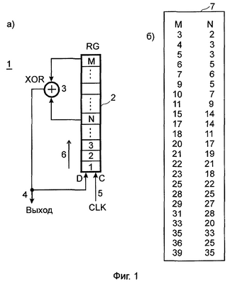 В общем случае при использовании М-разрядного регистра 2 цепь обратной связи подключается к разрядам с номерами М и N (М>N). Для того чтобы на выходе генератора формировалась псевдослучайная последовательность битов с периодом повторения, равным 2М – 1, следует выбирать точки подключения цепи обратной связи в соответствии с таблицей 7 (фиг.1, б), которая описывает ряд генераторов различной разрядности. При работе генератора в регистре 2 формируются все возможные М-разрядные коды, за исключением нулевого. (Отметим, что во всех описанных далее устройствах можно применять усовершенствованные генераторы, не имеющие запрещенных состояний, см., например, кн. Шевкопляс Б. В. “Микропроцессорные структуры. Инженерные решения”: Справочник. – Дополнение первое. – М.: Радио и связь, 1993. – 256 с.).