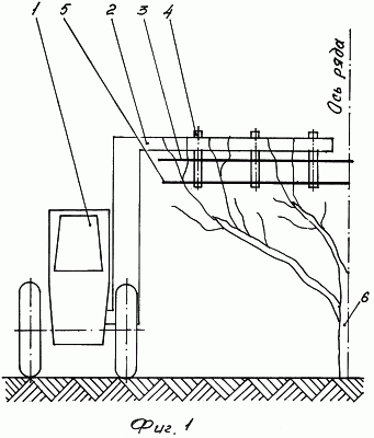 Машина для контурной обрезки плодовых деревьев работает следующим образом. Машина заезжает в междурядье сада, плодовые деревья которого необходимо обрезать по контуру. Режущий аппарат устанавливается на высоте, при которой дисковыми пилами 3 будут срезаться концы ветвей необходимой длины, т.е. длины, обеспечивающей их запахивание без забивания ими рабочих органов почвообрабатывающих машин. На таком же расстоянии от дисковых пил 3 на каждом валу 4 устанавливаются дополнительные дисковые пилы 5. Включается привод валов 4, на каждом из которых закреплены дисковая пила 3 и параллельно под ней на расстоянии, равном необходимой длины срезаемых ветвей, дополнительная дисковая пила 5, и начинают движение машины по междурядью. При подъезде к плодовому дереву 6 в процесс обрезки ветви вначале вступает дисковая пила 3, т.к. она больше по диаметру дополнительной дисковой пилы 5. Ветвь срезается. Затем эту же ветвь через некоторое время, которое зависит от скорости движения агрегата и разности между радиусом дисковой пилы 3 и дополнительной дисковой пилы 5, но ниже начинает срезать дополнительная дисковая пила 5. Так как разность между радиусами дисковой пилы 3 и дополнительной дисковой пилы 5 больше диаметра срезаемых ветвей, процессу контурной обрезки подлежат все ветви по ходу движения машины в проекции режущего аппарата. А в связи с тем, что рядом расположенные дополнительные дисковые пилы 5 установлены с перекрытием друг друга по ходу движения машины, пропусков несрезанных ветвей не будет. Дальнейшее снижение кроны плодовых деревьев достигается опусканием режущего аппарата на величину, равную двойному расстоянию по валу 4 между дисковой пилой 3 и дополнительной дисковой пилой 5 и последующему проходу машины по междурядью сада.
