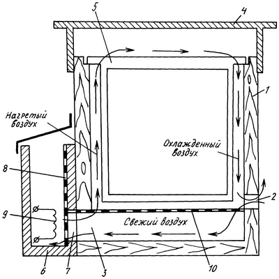 Электрообогрев улья осуществляется следующим образом. Разогретый электронагревателем 9 воздух через сетку 8, окна 7 и 3 электронагревателя и улья проходит вверх между противоположной от летка стенкой корпуса 1 и рамками 5, а также непосредственно между рамками и несколько охлаждается в верхней части улья, соприкасаясь с крышкой 4. После чего опускается к рамкам 5 и, проходя между ними, частью выходит через леток 2 наружу, а частью через металлическую экранирующую донную сетку 10 вновь уже охлажденный через окна 3 и 7 и сетку 8 в корпус 6 электронагревателя. Подсос свежего воздуха в корпус 6 электронагревателя осуществляется снаружи через леток 2.