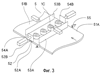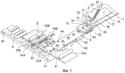 Над промежутком 52 расположены направляющие пластины 53А и 53В, которые могут сближаться или удаляться друг от друга при сужении или расширении промежутка 52 при помощи приводных средств, таких как пневматические цилиндры. С обеих сторон направляющих пластин 53А и 53В расположены направляющие пластины 54А и 54В. Они могут сближаться или удаляться друг от друга при помощи приводных средств, таких как пневматические цилиндры. Перед направляющей пластиной 53А расположено сенсорное устройство 55 для обнаружения кусков 1С теста.