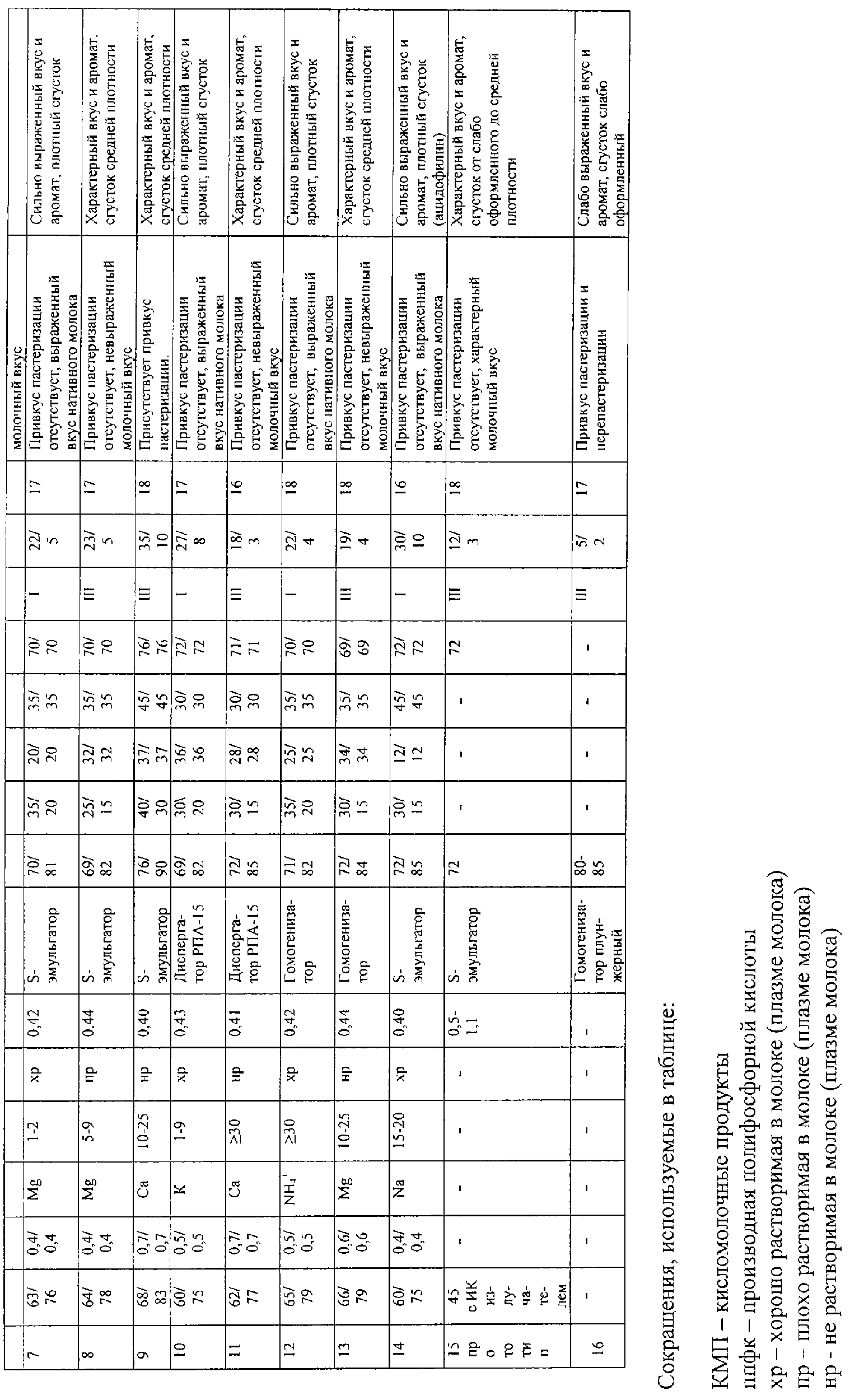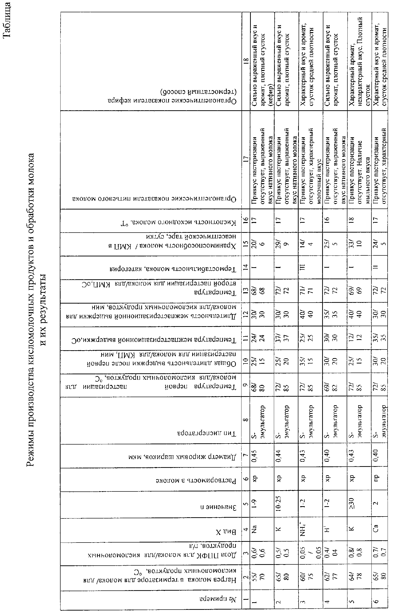Как видно из таблицы, при соблюдении всех условий обработки молока и производства кисломолочных продуктов, приведенных в формуле изобретения, по отношению к аналогам и прототипу наблюдается увеличение термостабильности молока, хранимоспособности питьевого молока и кисломолочных продуктов, улучшение органолептических вкусовых свойств питьевого молока и кисломолочных продуктов. Это иллюстрируют примеры 1, 2, 4, 7, 10, 12, 14. При выходе за рамки предложенных условий в какой-то их части улучшение наблюдается не по всем позициям характеристик. Так, пример б, иллюстрирующий обработку молока и производство кисломолочных продуктов при использовании плохо растворимой производной полифосфорной кислоты с кальцием, дает улучшение термостабильности, хранимоспособности, улучшение органолептических свойств кефира, однако вкуса молока не улучшает (но и не ухудшает). В примере 3 количество производной полифосфорной кислоты взято примерно на порядок меньше предложенного, поэтому термостабильность не улучшена, вкусовые качества молока не изменены, хотя возросла хранимоспособность молока, кефира по отношению к аналогу, прототипу. В примере 5 передозировка производной полифосфорной кислоты в количестве 0,1 г/л (всего добавлено 0,8 г/л) улучшает термостабильность молока, хранимоспособность молока и кисломолочных продуктов, но снижает органолептику. Нерастворимые производные полифосфорной кислоты (примеры 9, 11, 13) улучшают хранимоспособность, но при этом страдают вкусовые качества продукции. При повышении температуры пастеризации выше предложенной (пример 9) появляется вкус перепастеризации молока. Таким образом, поставленная задача решается только в объеме признаков изобретения, отраженных в независимых пунктах формулы. При этом в зависимости от варианта исполнения изобретения наблюдаются лучшие или ухудшенные по сравнению с лучшими вариантами результаты в рамках решенной задачи изобретения. Так, наиболее эффективными вариантами следует считать те, в которых используются хорошо растворимые в молоке производные полифосфорных кислот (в столбце 6 Таблицы обозначенные сокращением ХР) с дозой их содержания в пределах заявленного количественного диапазона, с невысокими значениями «n» в пределах 1-25, когда наблюдается значительное увеличение хранимоспособности (22-30 дней) и термостабильности (категория I). К ним относятся примеры 2, 4, 7, 10, 14 и некоторые другие. С точки зрения улучшения органолептических качеств молока и кисломолочных продуктов лучшими следует считать те варианты, в которых использовано минимальное содержание добавки производной полифосфорной кислоты в пределах заявленного количественного диапазона. В любом случае по сравнению с прототипом значительно повышены сроки хранения молока, значение термостабильности, улучшены органолептические свойства молока и кисломолочных продуктов на его основе.