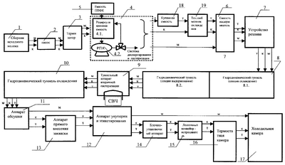 Линия состоит из последовательно соединенных сборника исходного молока – емкости накопителя 1, насоса 2, теплообменника – термизатора молока 3, системы диспергирования (гомоненизации) и пастеризации, состоящей из рециркуляционной емкости диспергирования и пастеризации 4.1., насоса-диспергатора или роторно-пульсационного аппарата 4.2. (далее РПА), с системой трубопроводов и клапанно-запорной арматурой (показана линиями условно). Выход рециркуляционной емкости 4.1. связан со входом РПА 4.2., выход которого связан со входом рециркуляционной емкости 4.1. через клапанно-запорную арматуру. Насос-диспергатор 4.2. может быть выполнен в виде гомогенизатора, коллоидной мельницы, инжекционного смесителя, форсунки, насоса-диспергатора (см. Новый политехнический словарь. Научное издательство «Большая Российская энциклопедия», 2000, стр.118, 145), роторно-пульсационного аппарата (см. патент РФ №2166986 с началом действия от 11 мая 1999 года) и тому подобного оборудования. В качестве диспергатора может быть использован роторно-пульсационный аппарат (S-эмульгатор), модель ТТ 520.00, производитель ЗАО «Промышленные Технологии», Россия, насос-диспергатор модель РПА-25-5(55,55А)-К, производитель фирма ЭНА, Россия, гомогенизатор плунжерный, модель А1-ОГМ-2,5, Россия. При необходимости гомогенизатор может быть снабжен дополнительным нагревателем для обеспечения требуемого температурного режима. Режим рециркуляции обеспечивается контуром обратной связи путем подачи порции молока с выхода диспергатора на его вход через рециркуляционную емкость. Система диспергирования и пастеризации 4 снабжена емкостью 5 для приготовления раствора производной полифосфорной кислоты (далее емкость ППФК), которая может быть выполнена в виде емкости с мешалкой или без нее. Линия содержит емкость-выдерживатель 6, который может представлять собой камеру в виде трубы, через которую непрерывным потоком проходит молоко в изотермических условиях. Камера может быть выполнена в виде трубы, цилиндрической емкости с рубашкой, трубчатого змеевика и пр. Линия содержит устройство розлива 7 с предварительной герметичной укупоркой, единый аппарат гидродинамического туннеля 8, состоящий из секции конвективного охлаждения 8.1. до температуры 12-37°С и секции выдерживания 8.2. при температуре 12-37°С, туннельный аппарат вторичной пастеризации 9, гидродинамический туннель охлаждения 10 или иное устройство охлаждения, например, оросительного типа из [1], стр.70, аппарат обсушки 11, аппарат укупорки и этикетирования 12, аппарат прямого внесения закваски 13, блочно-упаковочный аппарат 14, ленточный конвейер-встряхиватель 15, термостатную камеру 16, холодильную камеру 17. Линия может быть дополнена купажной емкостью 18, включенной между выходом системы диспергирования и пастеризации 4 и входом емкости-выдерживателя 6. Линия дополнена также теплообменником охлаждения 19 для кисломолочных продуктов, томленого молока, добавок, включенным между системой диспергирования и пастеризации 4 и входом емкости выдерживателя 6. Устройство розлива 7 может представлять собой разливочную машину, описанную в [1], стр.190-195, и использующую для фасовки пластиковые бутыли. Туннельный аппарат вторичной пастеризации 9 представляет собой изолированный канал с движущейся внутри вдоль него транспортерной лентой, на которую устанавливаются бут